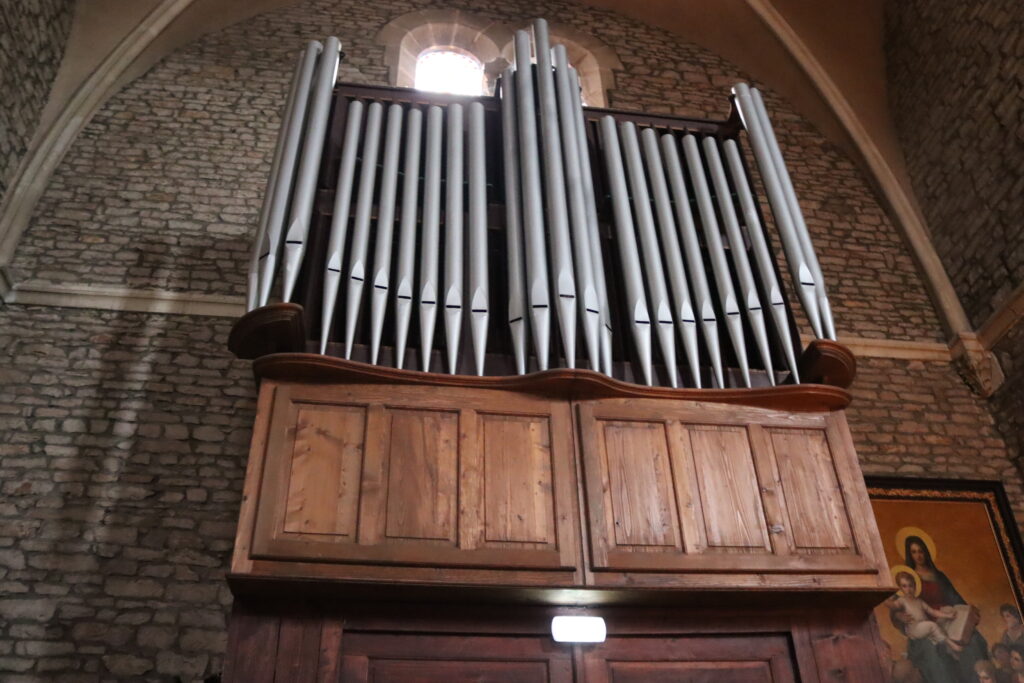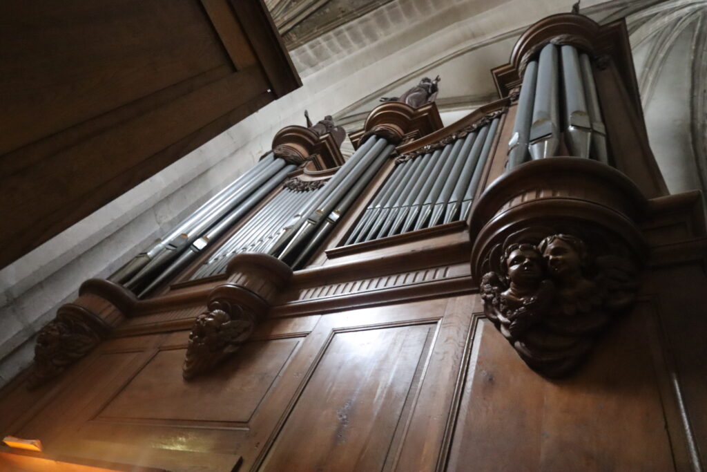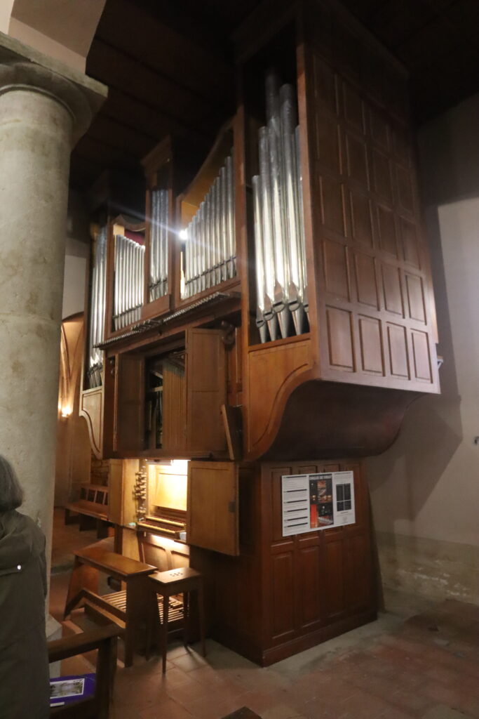 Magnifique découverte que cet orgue construit en 1835 : placé en tribune au-dessus du porche d’entrée. Le magnifique buffet de Claude-Ignace Callinet, aux têtes d’anges sculptées dans le chêne, nous rappelle l’orgue de Sallanches. Quelques marches plus haut, nous voilà dans l’antre de l’organiste, saisis par la hauteur des tuyaux de bois à l’arrière du buffet : c’est un jeu de 32 pieds de pédale, avec une hauteur de tuyaux dépassant les 10 mètres !