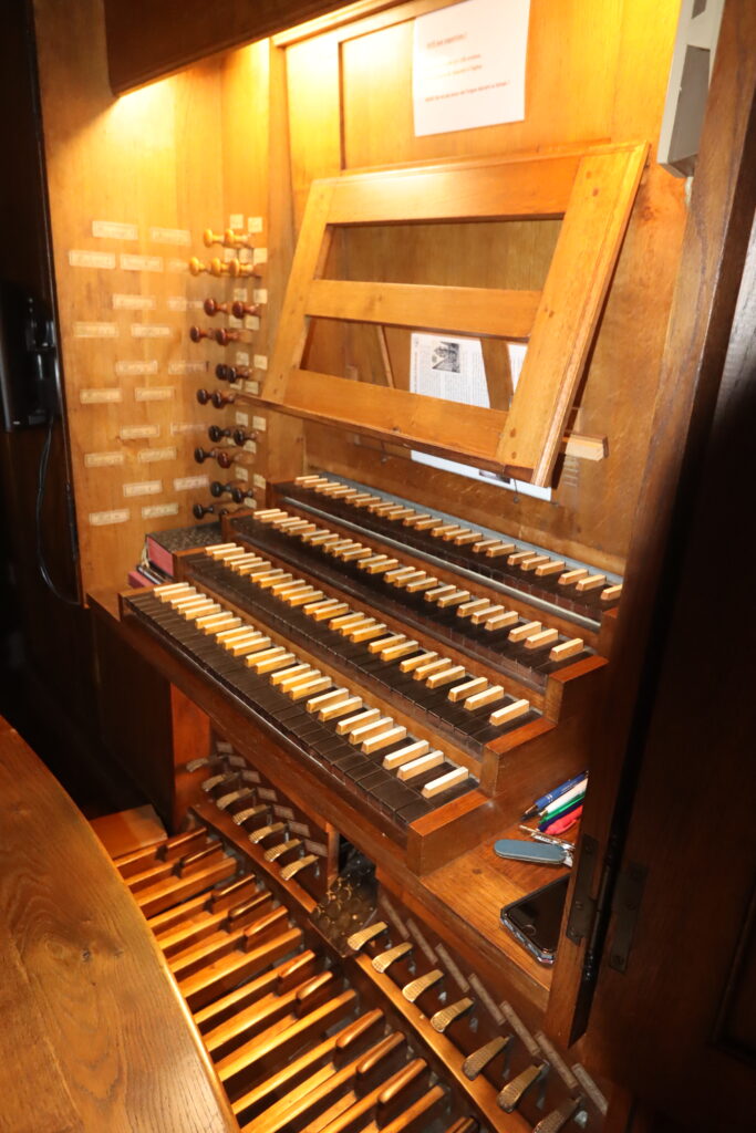 Et nous découvrons la console en fenêtre et ses 4 claviers : il a « tout ce qu’il faut » pour interpréter toute la musique classique française de Couperin, De Grigny, Clérambault…, mais bien sûr aussi Bach ou Buxtehude.