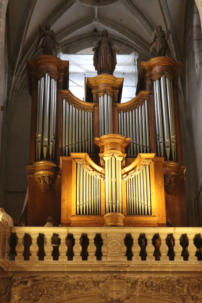 Sous une bonne pluie, nous rejoignons la préfecture de l’Ain et sa co-cathédrale. Malgré des travaux de rénovation en cours, l’édifice et son orgue restent accessibles.