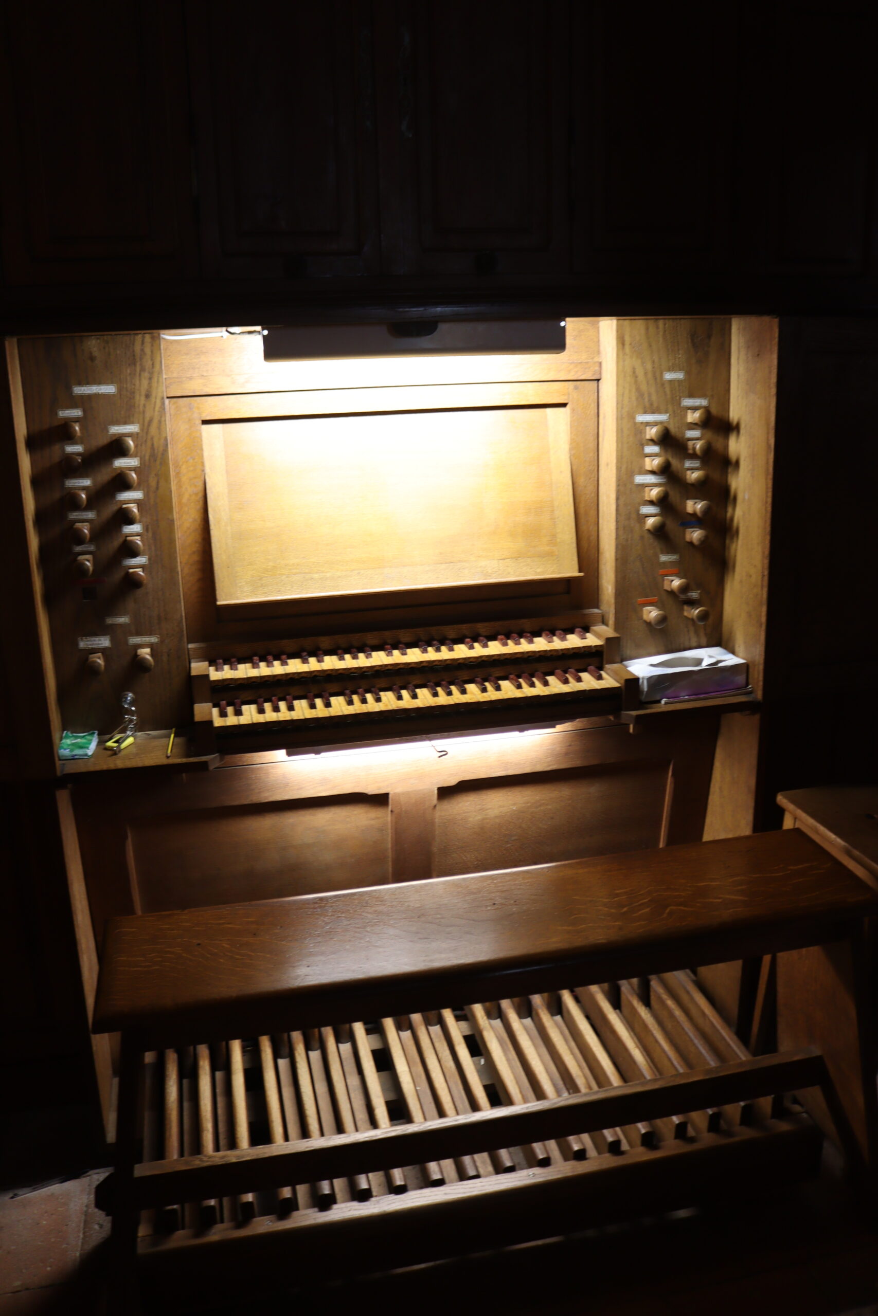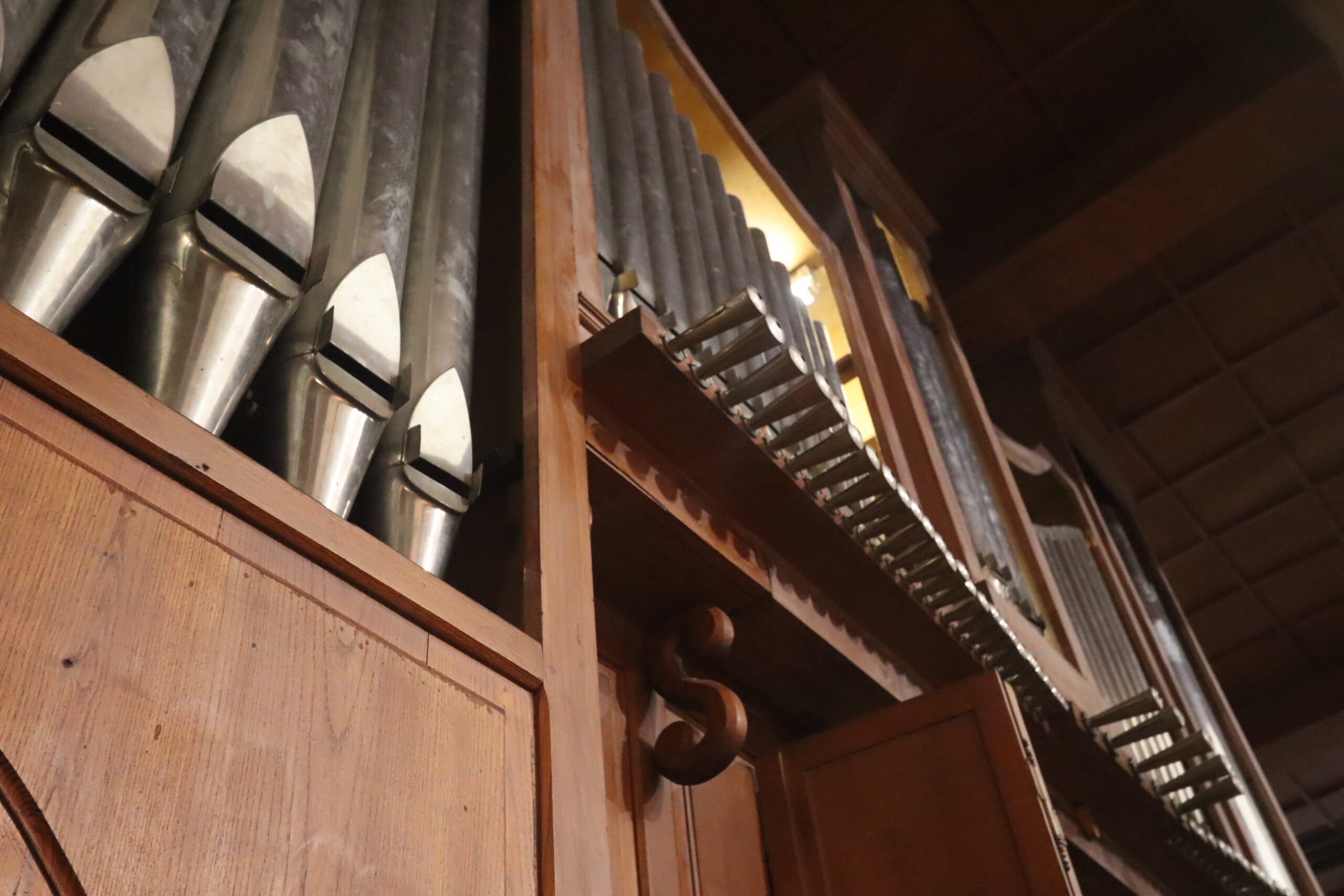 Magnifique découverte que cet orgue construit en 1835 : placé en tribune au-dessus du porche d’entrée. Le magnifique buffet de Claude-Ignace Callinet, aux têtes d’anges sculptées dans le chêne, nous rappelle l’orgue de Sallanches. Quelques marches plus haut, nous voilà dans l’antre de l’organiste, saisis par la hauteur des tuyaux de bois à l’arrière du buffet : c’est un jeu de 32 pieds de pédale, avec une hauteur de tuyaux dépassant les 10 mètres !