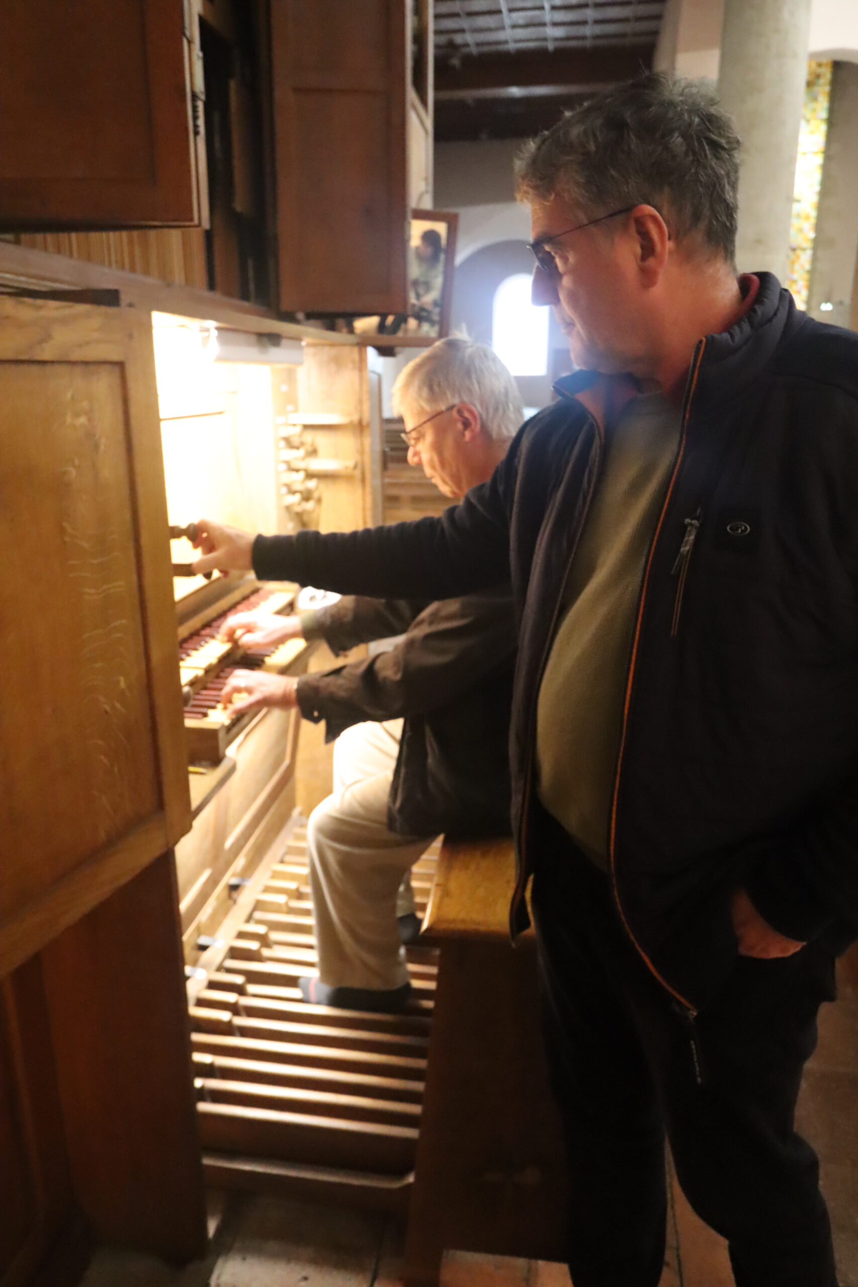 D’esthétique classique français, l’orgue comprend 10 jeux au Grand-Orgue dont un chalumeau 8’ en chamade (tuyaux horizontaux en façade), 7 au positif et 3 à la pédale. Après une présentation de l’instrument par Vincent et Blaise, les organistes visiteurs s’y essayèrent avec des pièces de Guilain, Muffat (Dominique) et Frescobaldi (Fabienne).