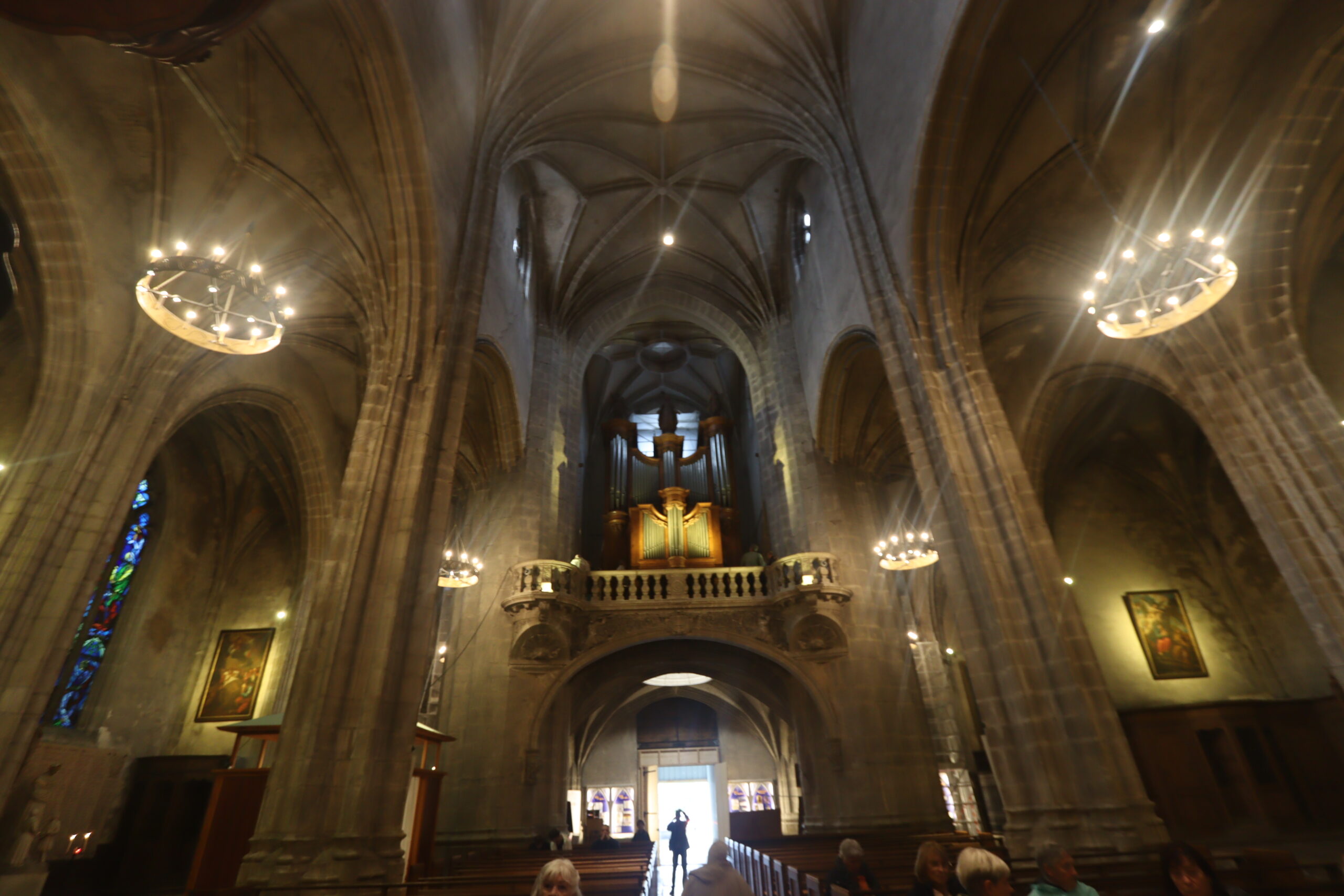 Sous une bonne pluie, nous rejoignons la préfecture de l’Ain et sa co-cathédrale. Malgré des travaux de rénovation en cours, l’édifice et son orgue restent accessibles.